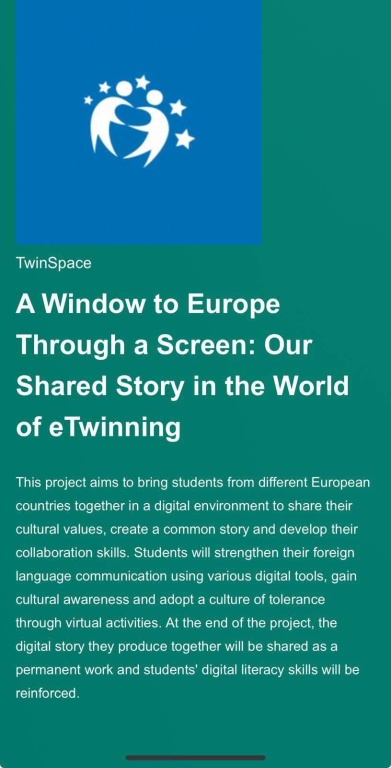 "A Window to Europe Through a Screen: Our Shared Story in the World of eTwinning" adlı bu proje ile öğrencilerimiz, Web 2.0 araçlarını kullanarak dijital becerilerini geliştirecek, yaratıcı ve özgün içerikler üreteceklerdir. Ayrıca takım çalışması ve iş birliğiyle ortak ürünler ortaya koyacak, proje tabanlı öğrenme yaklaşımını birebir deneyimleyeceklerdir.