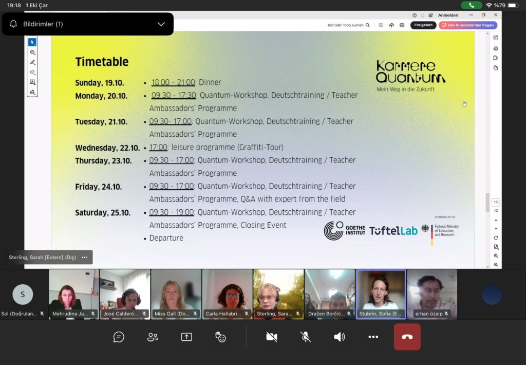 Kamp öncesinde, proje ve katılım süreciyle ilgili detayların paylaşılması amacıyla Goethe-Enstitüsü yetkilileri ile çevrimiçi bir ön toplantı gerçekleştirildi. Toplantı, gidecek olan öğrencilerimiz ve danışman öğretmenimizin katılımı ile gerçekleştirildi.